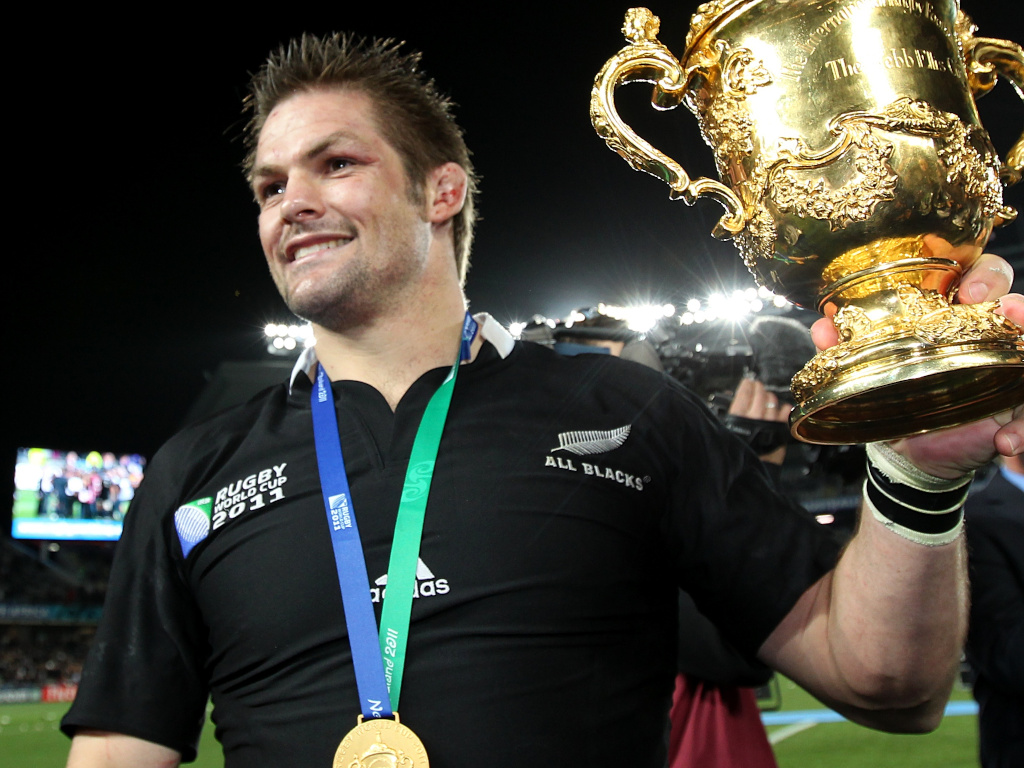 New Zealand captain Richie McCaw with the Webb Ellis Cup as he celebrates winning the World Cup Final