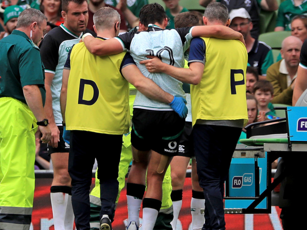 Joey Carbery of Ireland leaves the field injured during the Guinness Summer Series match at the Aviva Stadium, Dublin.