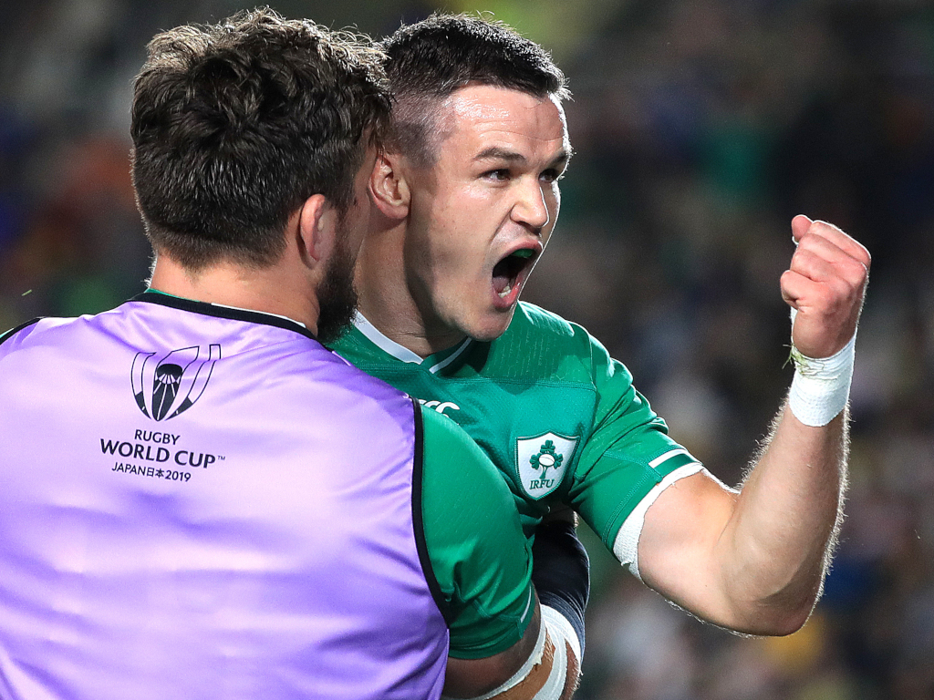 Ireland's Johnny Sexton celebrates scoring his side's third try of the game during the 2019 Rugby World Cup Pool A match at Fukuoka Hakatanomori Stadium.