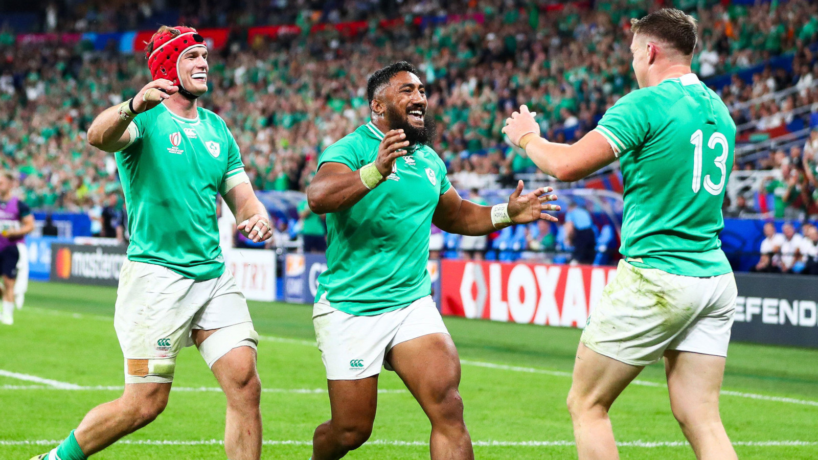 Ireland celebrate Garry Ringrose's try against Scotland in the Rugby World Cup.