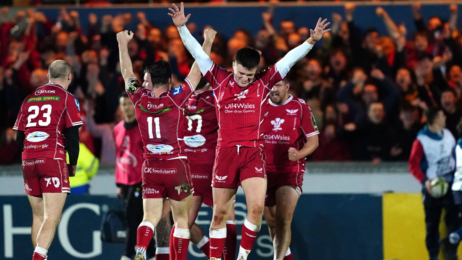 2PKGG8A Scarlets' Joe Roberts celebrates victory following the European Challenge Cup, Quarter Final match at the Parc y Scarlets, Swansea. Picture date: Friday April 7, 2023.