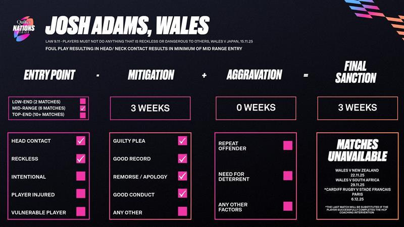 Adams was issued with a yellow card, and the incident was sent to be reviewed by Immelman, who upgraded the sanction to a 20-minute red card.