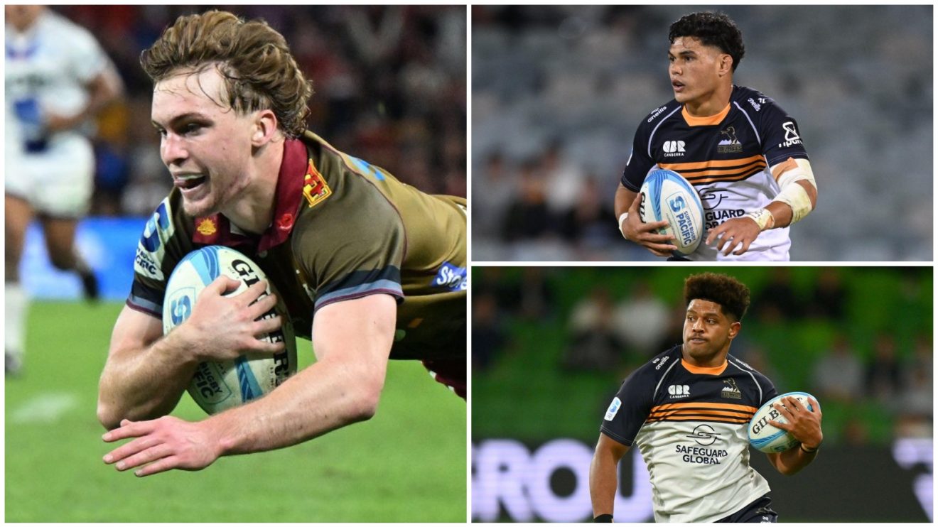 Tin Ryan of the Reds and Brumbies duo Noah Lolesio and Rob Valetini.