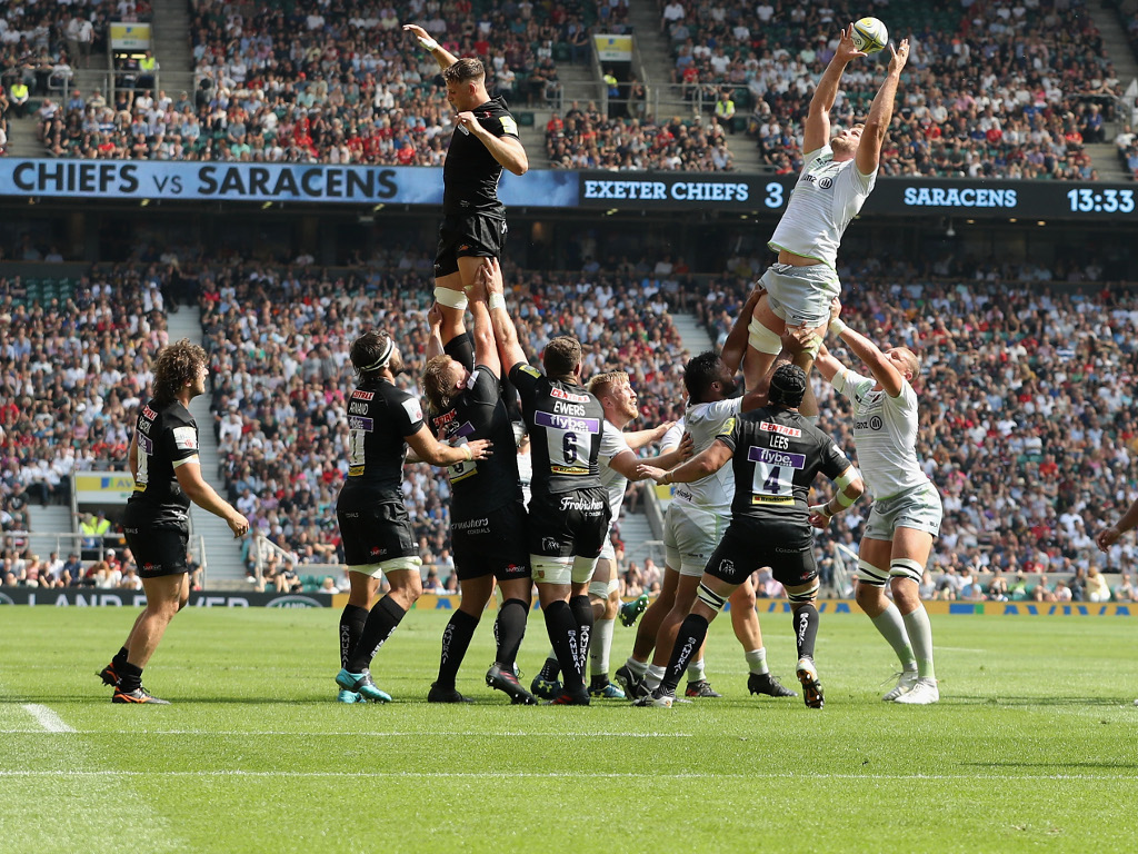during the Aviva Premiership Final between Exeter Chiefs and Saracens at Twickenham Stadium on May 26, 2018 in London, England.