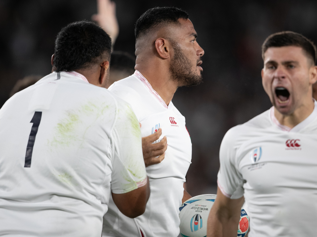 Manu Tuilagi of england celebrates with team mates after scoring their first tryduring the Rugby World Cup semi-final match between England and New Zealand in Kanagawa Prefecture, Japan, on October 26, 2019. International Stadium Yokohama.( ESPA/Cal Sport Media/Sipa USA )